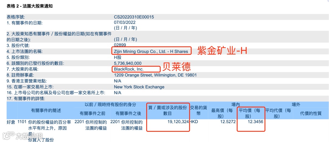 据港交所信息披露文件显示,全球头号资管机构——贝莱德3月7日增持了1912万股锂电龙头紫金矿业-H,这笔交易价值2.36亿港元。增持后,贝莱德持有股份占紫金矿业于港股市场发行股份数目的8.03%。