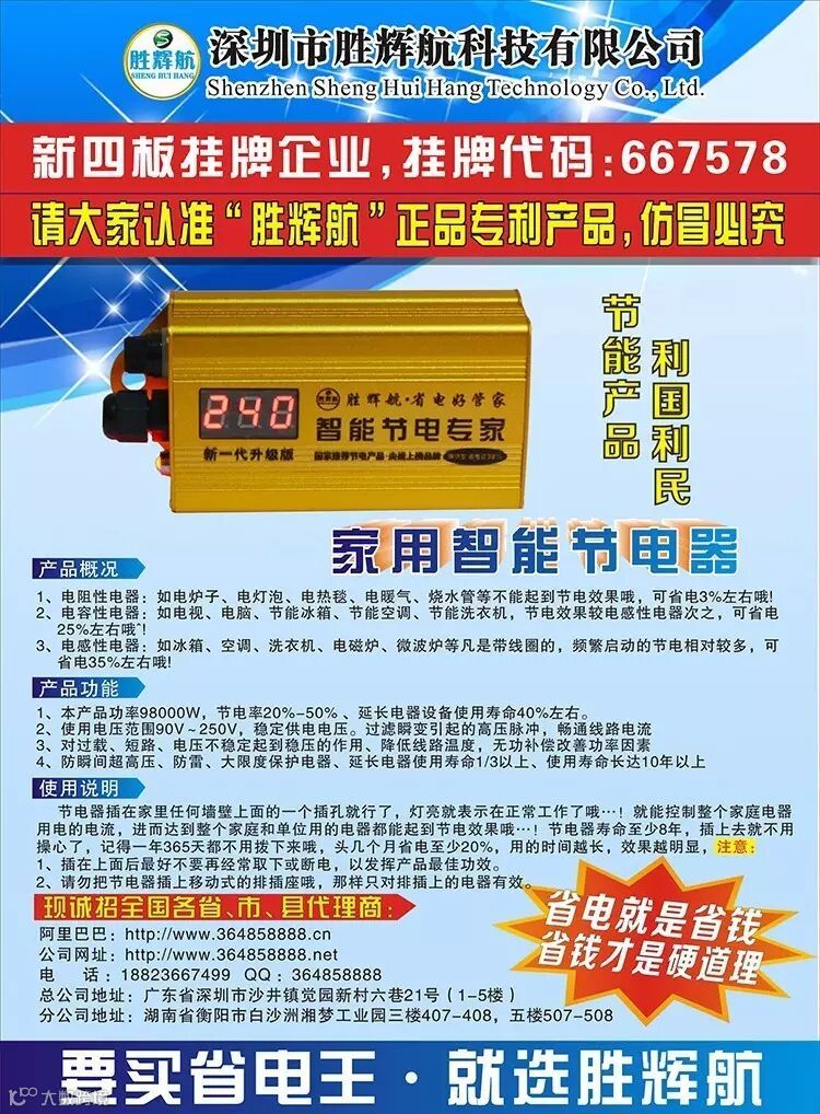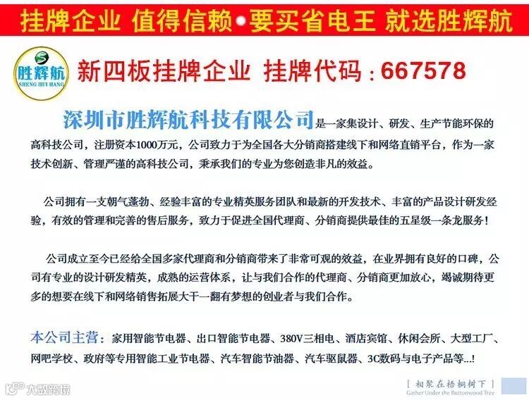 据悉;作为行业领先拥有自主品牌和多项专利专注于研发节能环保产品有节电王之称的深圳市胜辉航科技有限公司也因此成为在该交易中心挂牌的首家专注于节电、节能领域的科技公司。