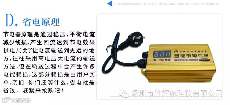 据深圳市胜辉航科技有限公司总经理陈功辉介绍,胜辉航是一家专注于设计、研发、生产节电器、节油器的高科技公司,公司主营:家用智能节电器、出口智能节电器、380V三相电、酒店宾馆、休闲会所、大型工厂、网吧学校、政府机关等专用智能工业节电器、汽车智能节油器、汽车驱鼠器、3C数码与电子产品等...!