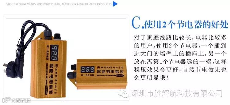对于家庭线路比较长,电器比较多的用户,使用2个节电器,一个插到进大门的墙壁上的插座上,另一个放在离第1个节电器远的一端,这样稳压效果会更好,自然节电效果也会更明显哦…!