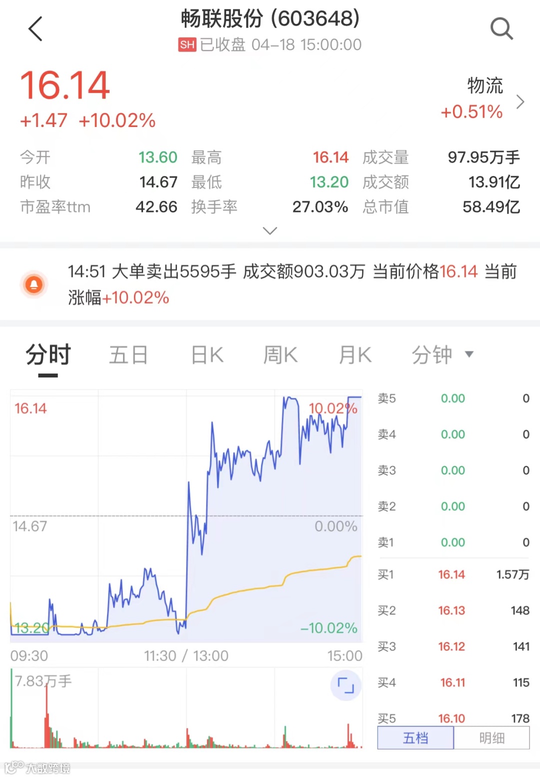 今日畅联股份全天成交13.91亿元,跌停价13.20元/股成交20.2万手,成交额为2.67亿元,跌停价买入成交部分今日浮盈金额达5939万元。