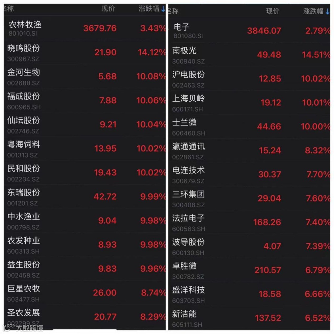 农林牧渔行业中,晓鸣股份涨逾14%,金河生物、福成股份、仙坛股份、粤海饲料等多股涨停。