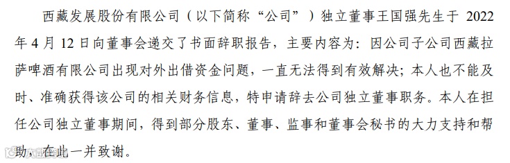 *ST西发独立董事王国强4月12日向董事会递交了书面辞职报告,辞职理由是:“因公司子公司西藏拉萨啤酒有限公司(简称“拉萨啤酒”)出现对外出借资金问题,一直无法得到有效解决;本人也不能及时、准确获得该公司的相关财务信息,特申请辞去公司独立董事职务。”