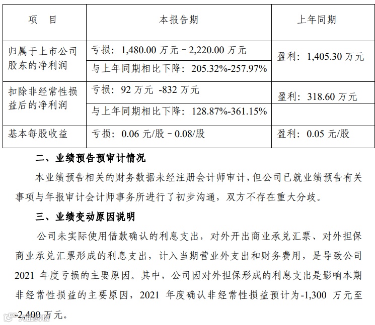 2022年1月29日,*ST西发发布2021年度业绩预告,公司预计2021年实现归属于上市公司股东的净利润亏损1480万元-2220万元,上年同期为盈利1405.3万元。对于业绩变动原因,公告称,公司未实际使用借款确认的利息支出,对外开出商业承兑汇票、对外担保商业承兑汇票形成的利息支出,计入当期营业外支出和财务费用,是导致公司2021年度亏损的主要原因。