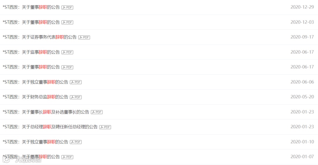 4月13日晚,原定于4月29日披露2021年年报的*ST西发公告称,因公司子公司对外出借资金问题无法解决,公司独董辞职。今年1月,一位独董刚因“精力所限”辞职。值得注意的是,仅2020年一年,公司就收到了11位董监高的辞职申请,辞职对象包括公司董事长、总经理、财务总监、董事、监事、证券事务代表等。