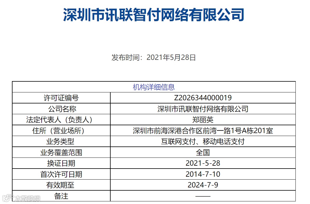 中国证券报·中证金牛座记者查询中国人民银行网站获悉,2014年7月,深圳市讯联智付网络有限公司获得支付牌照,业务类型为互联网支付、移动电话支付、数字电视支付,业务覆盖范围为全国。最新信息显示,目前开展的业务类型仅为互联网支付、移动电话支付,有效期至2024年7月。