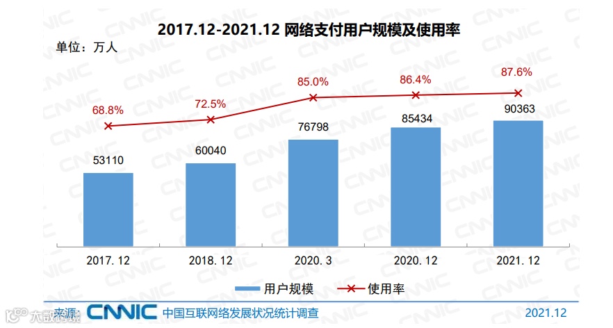 2月份,中国互联网络信息中心发布的报告显示,截至2021年12月,我国网络支付用户规模达9.04亿,较2020年12月增长4929万,占网民整体的87.6%。数据显示,2021年前三季度,银行共处理网上支付业务745.56亿笔,金额1745.9万亿元,分别同比增长17.3%和10.5%。