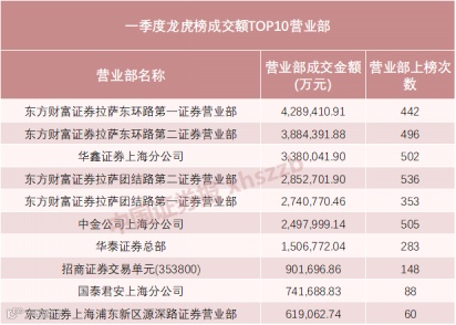 根据Wind统计,今年一季度,4633家券商营业部共20405次登上龙虎榜,成交金额为5939.59亿元。其中,百强营业部今年一季度的成交额高达3946.08亿元,占4633家营业部总成交额的66.44%。