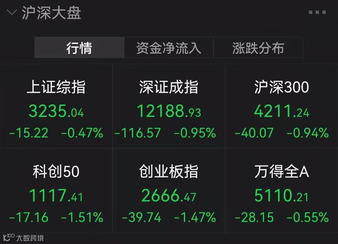 今日早盘,A股三大股指弱势震荡,临近午盘扩大跌幅。上证指数午盘报3235.04点,跌0.47%;创业板指报2666.47点,跌1.47%;深证成指报12188.93点,跌0.95%。