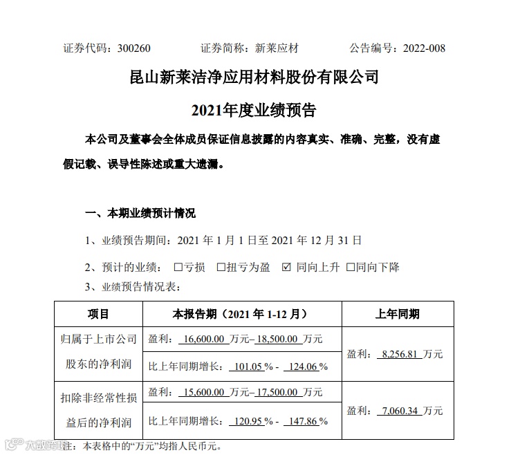 1月25日,新莱应材发布2021年度业绩预告。公司预计,2021年度归母净利润为1.66亿元-1.85亿元,同比增长101.05%-124.06%。