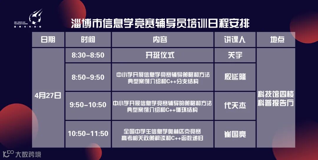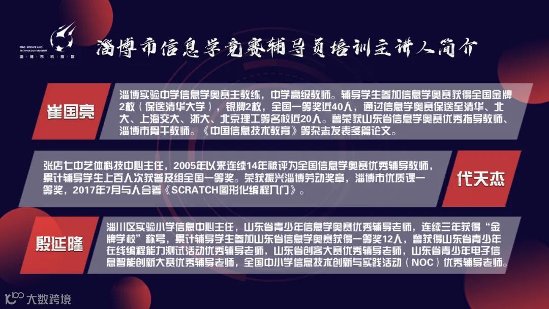 2.本次培训采用线上线下相结合的方式进行,线下现场培训限报120人,所有参加培训的辅导员需自备笔记本电脑,按照报名的先后顺序安排。现场未报名成功的可通过视频直播观看培训。请各单位负责人提前加入“淄博市青少年信息学科技辅导员培训”QQ群,群号:783608977,发布培训相关安排和视频直播地址。本次活动为公益活动,不收取任何费用,自愿参加。