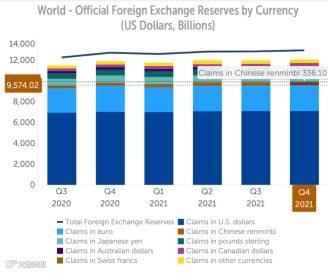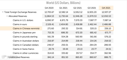 人民币储备规模也节节攀升,IMF数据显示,2021年第四季度,人民币外汇储备总额由2021年第三季度的3201.5亿美元升至3361亿美元。