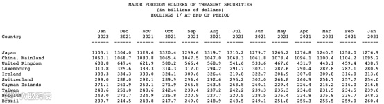 美国财政部公布的2022年1月海外投资者持有美债规模数据,也显示出美债被减持的迹象。其中,日本作为美国国债的最大持有人,与2021年12月相比,1月减持美国国债9亿美元;中国在2022年1月减持美国国债86亿美元。