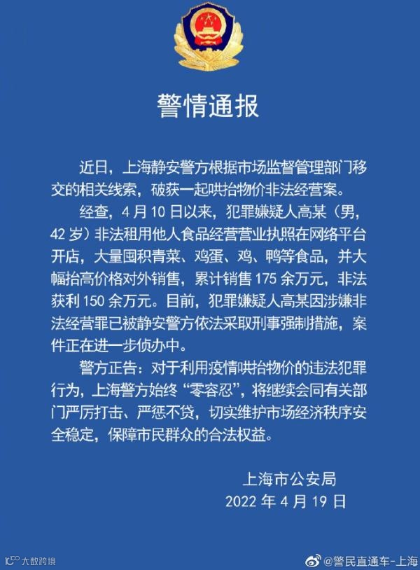 经查,4月10日以来,犯罪嫌疑人高某(男,42岁)非法租用他人食品经营营业执照在网络平台开店,大量囤积青菜、鸡蛋、鸡、鸭等食品,并大幅抬高价格对外销售,累计销售175余万元,非法获利150余万元。目前,犯罪嫌疑人高某因涉嫌非法经营罪已被静安警方依法采取刑事强制措施,案件正在进一步侦办中。