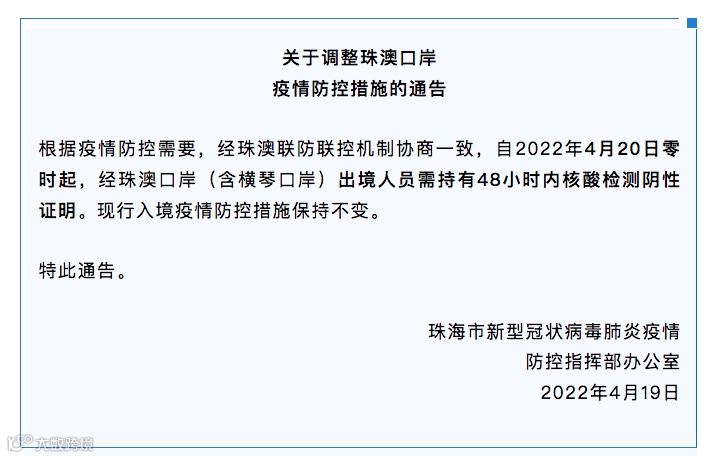 据“珠海发布”微信公众号,珠海市新型冠状病毒肺炎疫情防控指挥部办公室19日发布通告称,根据疫情防控需要,经珠澳联防联控机制协商一致,自2022年4月20日零时起,经珠澳口岸(含横琴口岸)出境人员需持有48小时内核酸检测阴性证明。现行入境疫情防控措施保持不变。