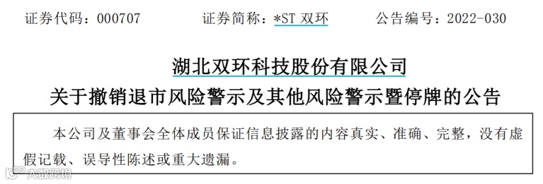 3月24日晚间,*ST双环公告,公司股票3月25日停牌一天,3月28日开市起复牌。公司自3月28日开市起撤销退市风险警示及其他风险警示,股票简称由“*ST双环”变更为“双环科技”。