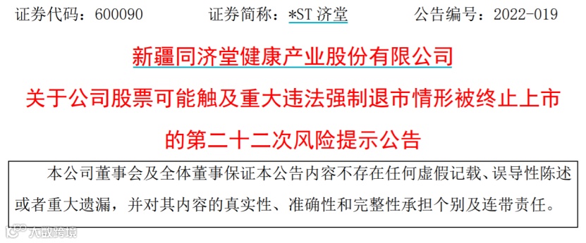 *ST新亿之后,*ST济堂也很可能面临同样的结局。3月25日晚间,*ST济堂发布关于公司股票可能触及重大违法强制退市情形被终止上市的第二十二次风险提示公告。