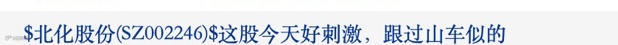 北化股份今日上演超级行情,股吧里面有股民直呼“第一次见”,有的股民称:“这股好刺激,跟过山车似的。”