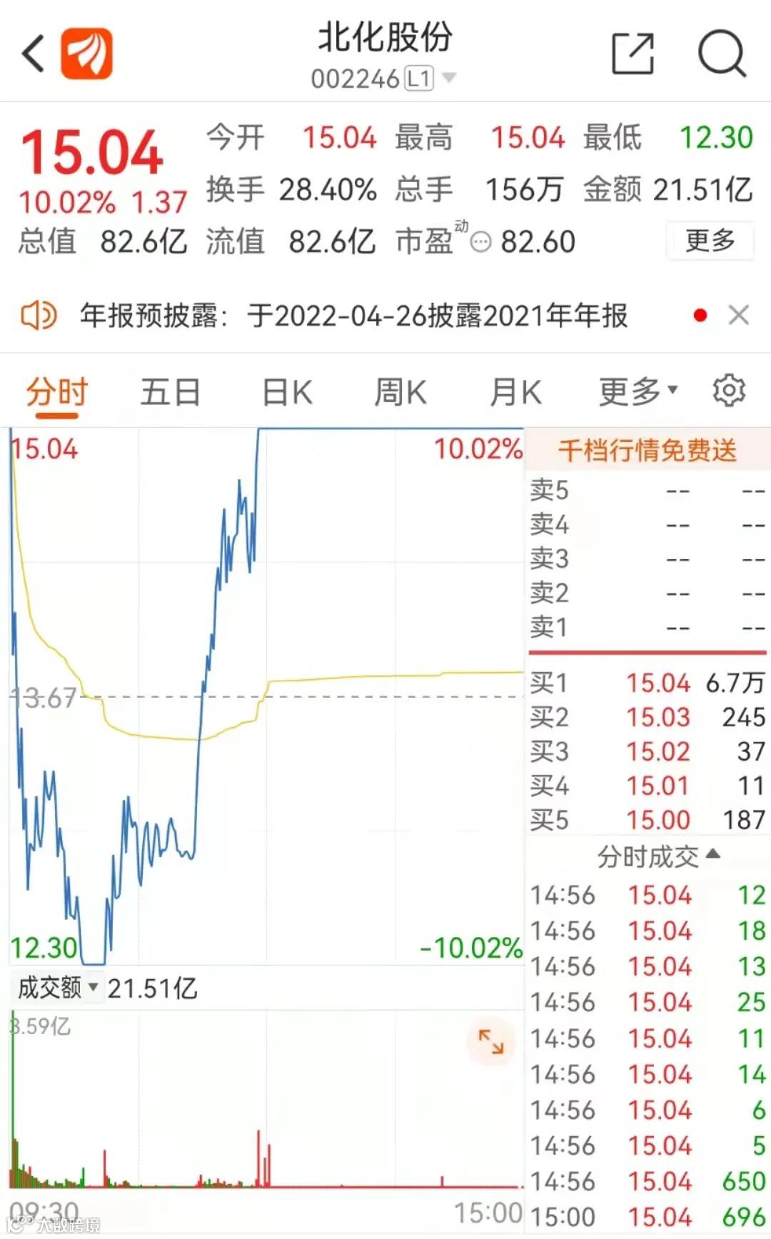 新冠自检概念妖股北化股份今天上演了“天地天板”行情。