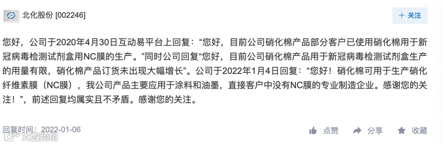 2020年,公司在互动平台回应投资者时表示,目前公司硝化棉产品部分客户已使用硝化棉用于新冠病毒检测试剂盒用NC膜的生产。