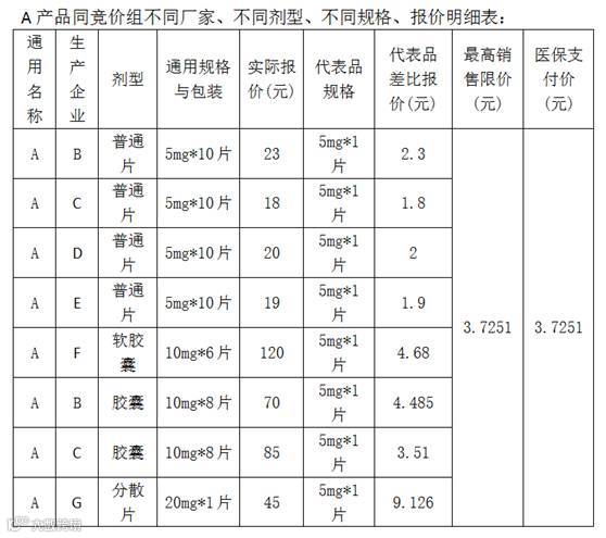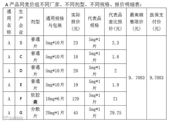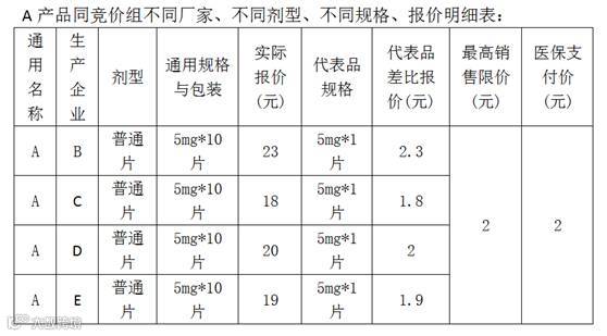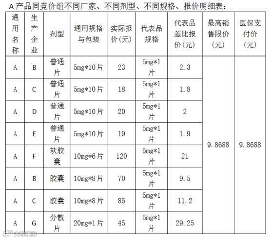 所谓代表品规则是指:在计算医保支付价是只参考与代表品同一剂型、同一规格的厂家所报报价,不参考其他剂型、其他规格的报价,见表三: