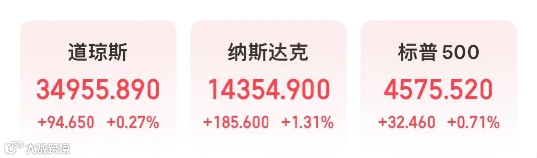 周一,美股三大指数集体上涨。纳指涨1.31%,报14354.9点,创1月18日以来收盘新高;标普涨0.71%,报4575.52点,连续第三个交易日创2月9日以来新高;道指涨94.65点,涨幅0.27%,报34955.89点,创2月15日以来新高。
