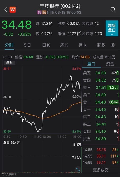 3月18日,宁波银行股价震荡上扬,临近收盘时涨幅一度接近2%。然而就在收盘前的集合竞价阶段,交易量突然放大,股价直线下跌,幅度超过2%。截至收盘,宁波银行股价跌0.92%,报34.48元/股。