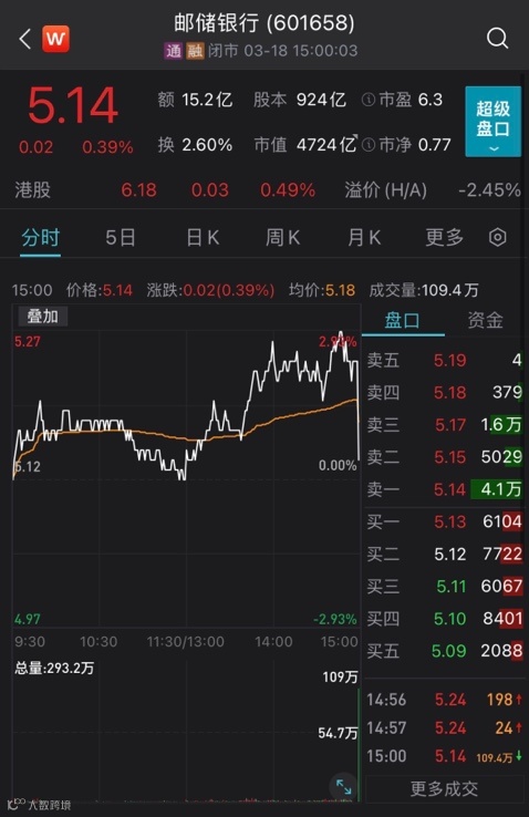 与宁波银行一样,被新纳入富时中国A50指数的邮储银行尾盘同样出现跳水,交易量显著放大。