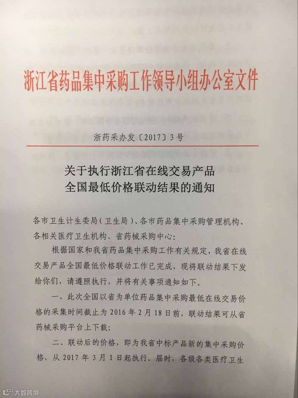 根据省药品集中采购工作领导小组办公室《关于执行浙江省在线交易产品全国最低价格联动结果的通知》(浙药采办发〔2017〕3号),以及浙江省省级医疗保险服务中心有关文件精神,现将我省在线交易产品执行全国最低价联动结果和2017年度医保支付标准有关具体事项通知如下:
