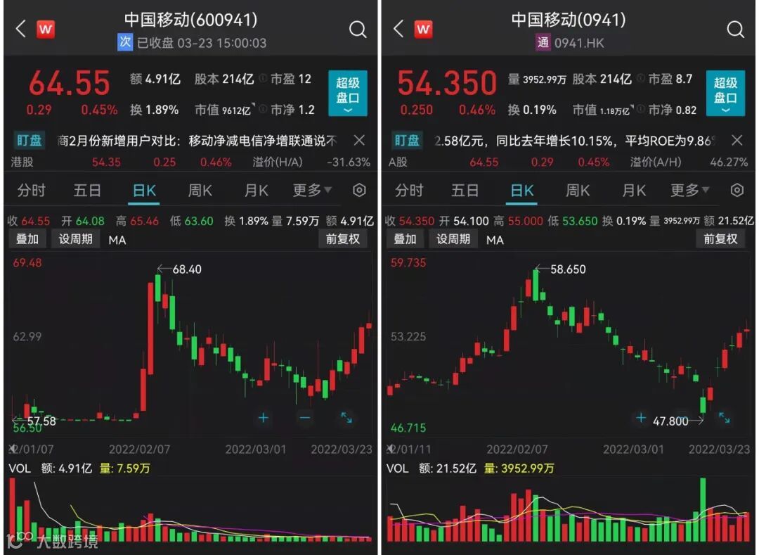 中国移动A股最新报64.55元/股,港股报54.35港元/股。