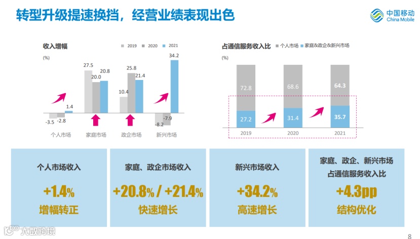 中国移动主营收入来源包括个人市场、家庭市场、政企市场、新兴市场四部分。2021年,中国移动的个人市场业务扭转下滑趋势,实现正增长,家庭市场、政企市场收入保持20%以上的快速增长,新兴市场收入增长超30%,实现V型反转;家庭、政企、新兴市场占主营业务收入比提升4.3个百分点,达到35.7%,收入结构持续优化。