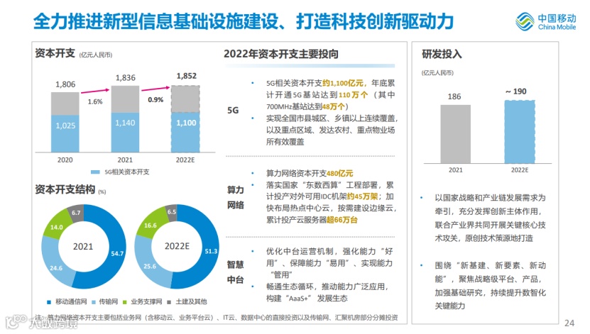 财报显示,2021年中国移动的资本开支达1836亿元,其中5G相关资本开支达1140亿元,公司预计2022年资本开支为1852亿元,其中5G相关资本开支约1100亿元。