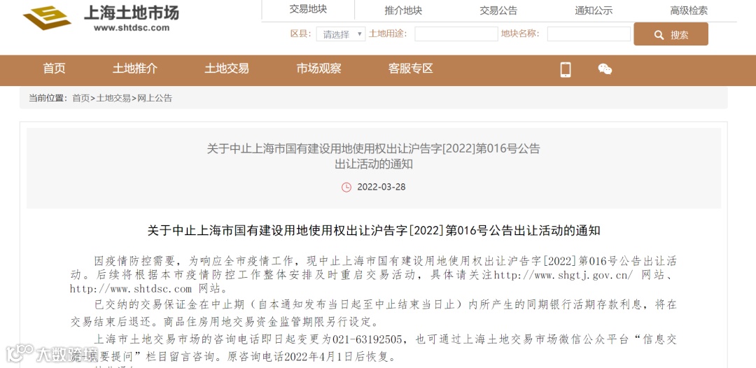 3月28日,上海土地市场官网发布通知,因疫情防控需要,为响应全市疫情工作,现中止上海市国有建设用地使用权出让活动。后续将根据本市疫情防控工作整体安排及时重启交易活动。
