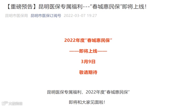 日前,昆明市医保订阅号微信公众号发布消息称,2022年度“春城惠民保”将于3月9日上线。据悉,昆城惠民保“春城惠民保”自2021年上线,目前第一个承保周期即将结束。相比2021年度版本,2022年度“春城惠民保”价格不变,同时下降免赔额以及扩大保障范围。