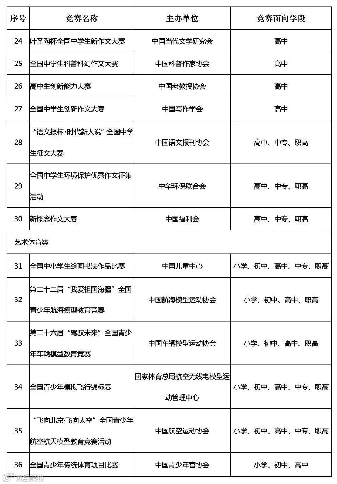 2021-2022学年的白名单含36项竞赛活动,比赛分为“自然科学素养类”、“人文综合素养类”、“艺术体育类”三个大类,涵盖了6-18岁学生。