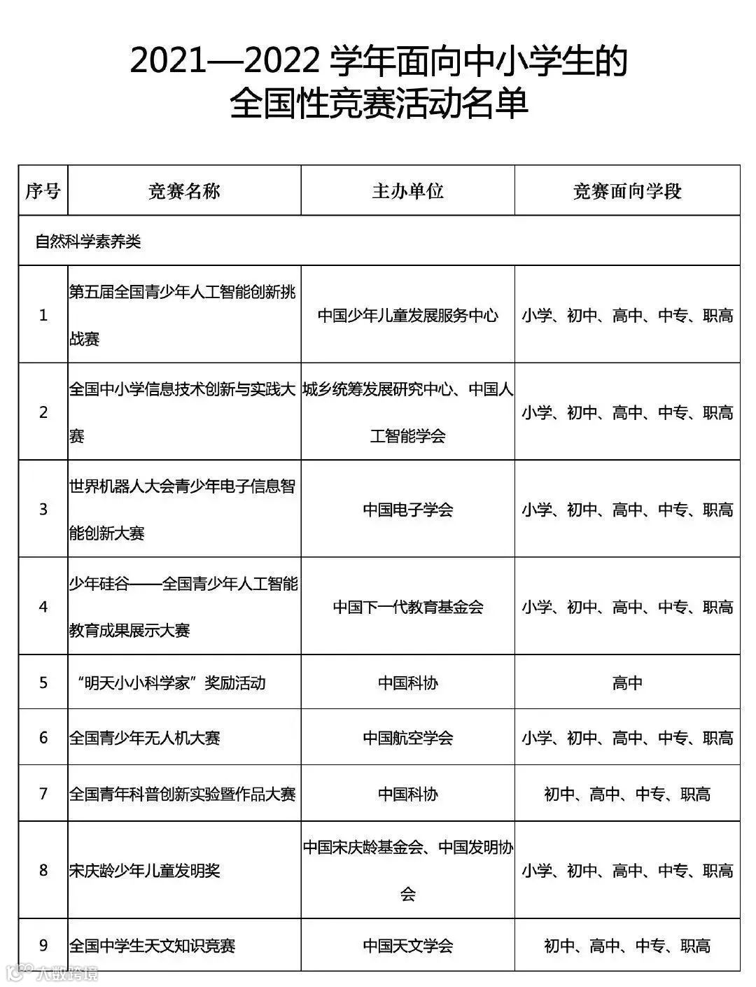 从名单中不难看出,在2021-22学年的比赛名单中,自然科学素养类20项、人文综合素养类10项、艺术体育类6项。