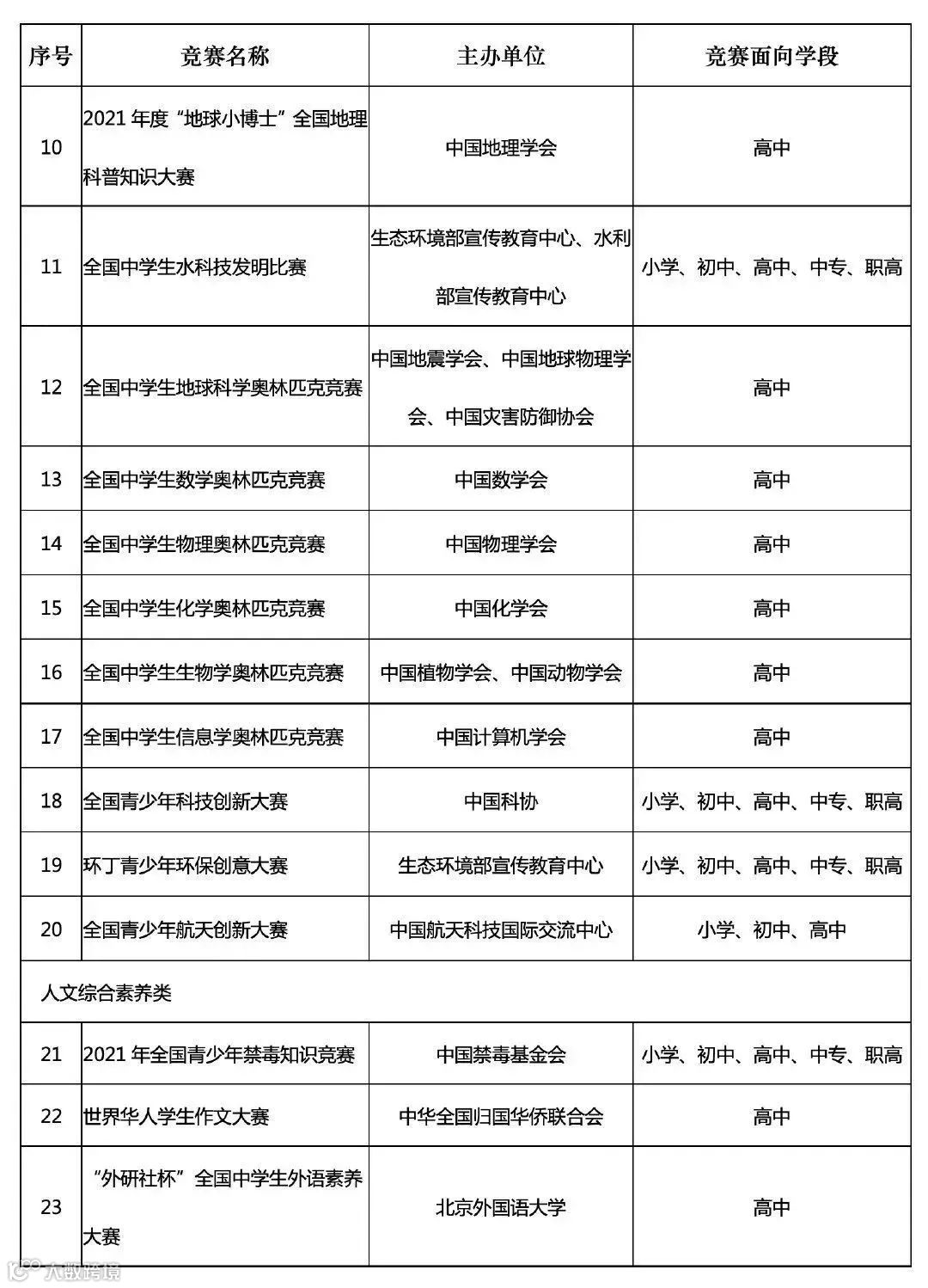 中小学生全国性竞赛名单
