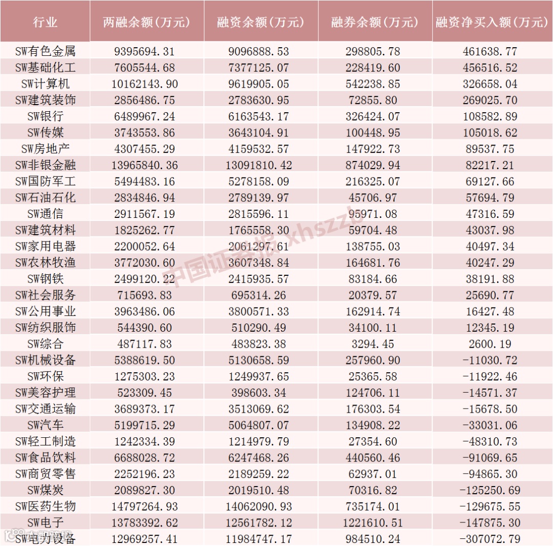 从行业情况来看,2月份申万一级行业中有19个行业融资余额增加,有色金属、基础化工、计算机行业融资余额增加金额居前,分别增加46.16亿元、45.65亿元、32.67亿元,这三个行业获融资客净买入超120亿元;电力设备、电子、医药生物行业融资净卖出金额居前,分别净卖出30.71亿元、14.79亿元、12.97亿元。