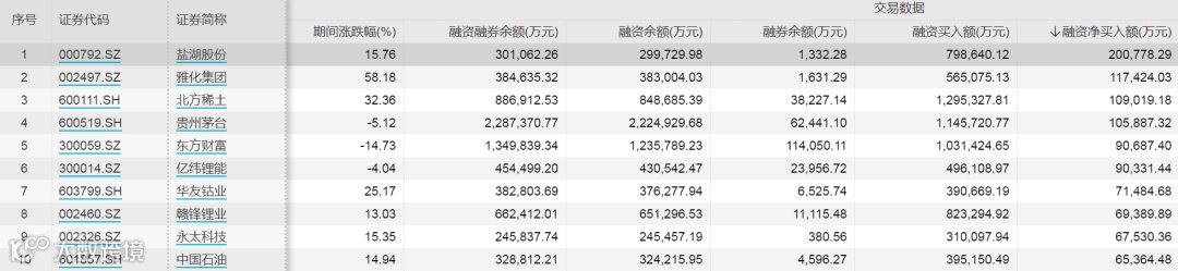 从个股情况来看,2月份融资客加仓居前的10只股票分别为盐湖股份、雅化集团、北方稀土、贵州茅台、东方财富、亿纬锂能、华友钴业、赣锋锂业、永太科技、中国石油,分别获净买入20.08亿元、11.74亿元、10.90亿元、10.59亿元、9.07亿元、9.03亿元、7.15亿元、6.94亿元、6.75亿元、6.54亿元。从市场表现上来看,这10只股票中除贵州茅台、东方财富、亿纬锂能2月份分别累计下跌5.12%、14.73%、4.04%外,其他股票2月份均上涨,雅化集团2月份累计涨幅达58.18%,融资客收益颇丰。在2月融资客加仓居前的股票中,有多只锂矿股。