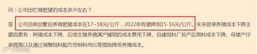 12.67元/公斤的价格,实际上已远低于养猪企业的成本价。在1月4日的一份投资者关系记录中,华统股份表示:公司目前自繁自养育肥猪成本在17-18元/公斤,2022年有望降到15-16元/公斤。