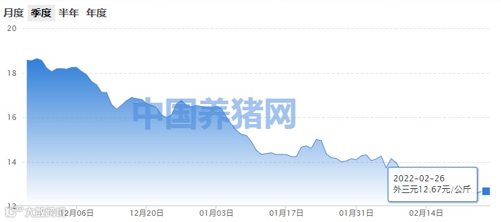 中国养猪网的数据显示,从2021年末以来,生猪(外三元)价格已从超过18元/公斤下跌至目前的12.67元/公斤。