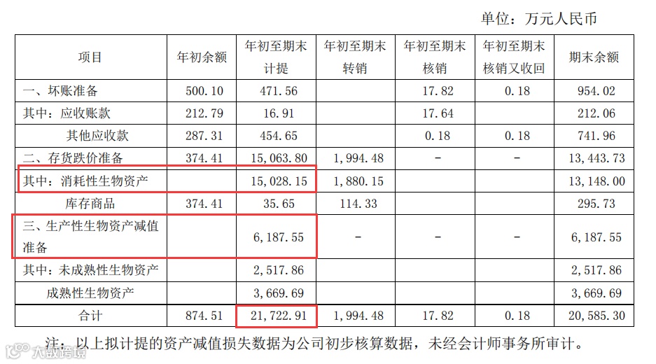 在另一份计提资产减值准备的公告中,华统股份对计提资产减值准备做了详细解释,其中最主要的有两项:一是2021年度主要由于国内生猪市场价格发生大幅下降等原因,公司基于谨慎性原则,对存货计提跌价准备1.50亿元;二是2021年底,考虑到生产性生物资产较多,国内生猪行情预期不明朗,经公司管理层减值测式,对生产性生物资产计提减值6187.55万元。