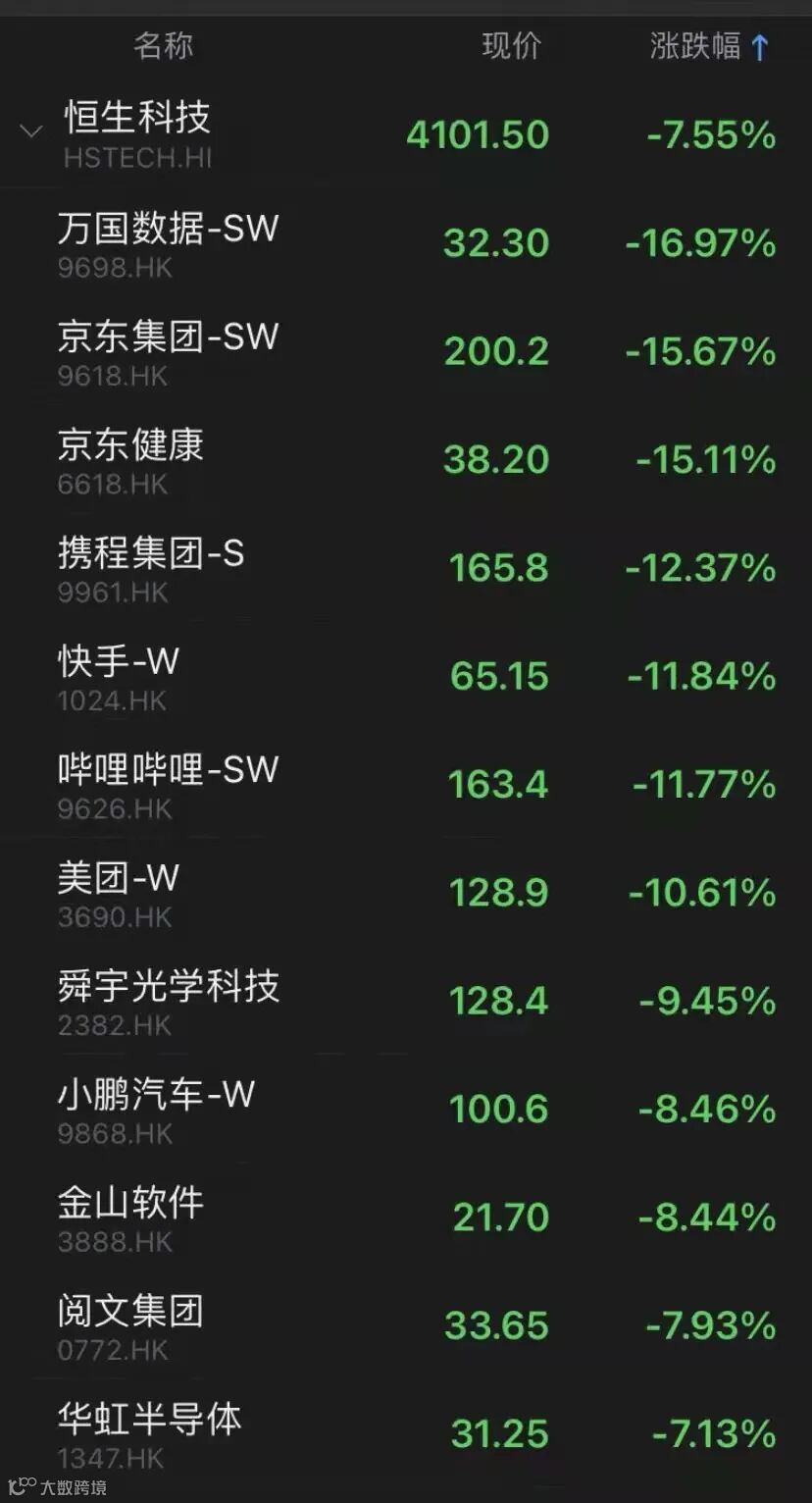 恒生科技指数午间收盘下跌超7%,成分股全线下跌。其中,万国数据跌近17%,快手、美团、哔哩哔哩等多股跌超10%。