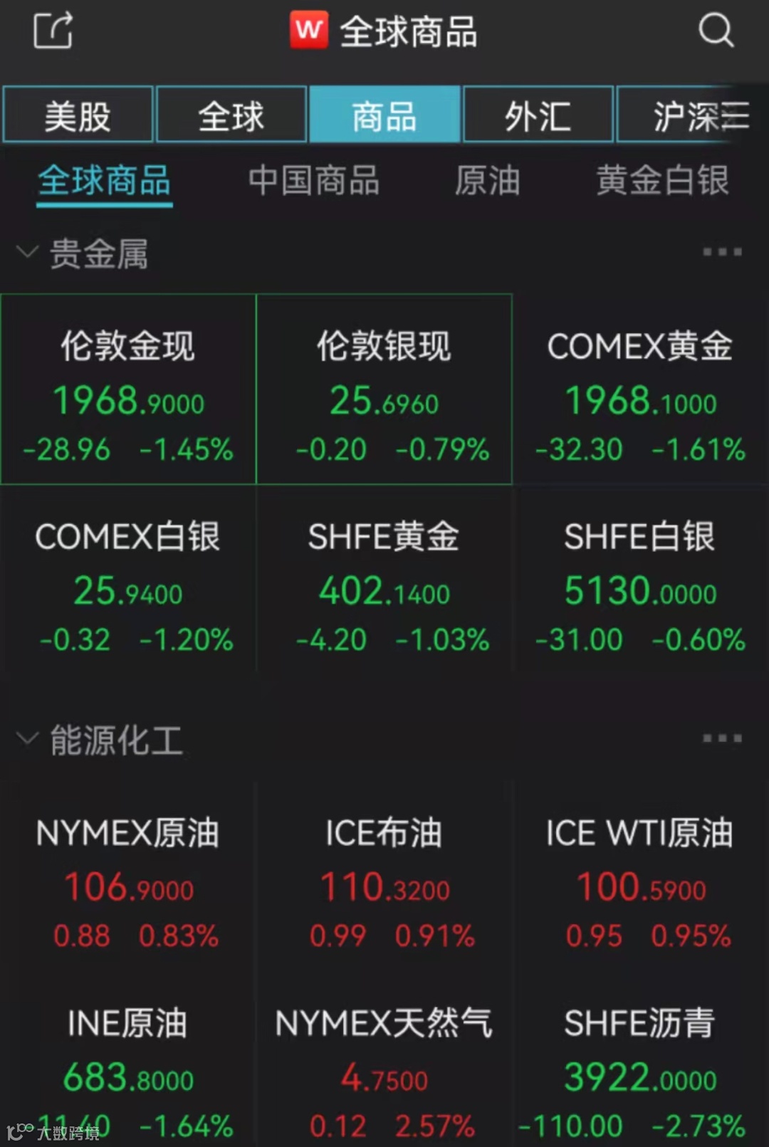 截至北京时间22:32,NYMEX原油、ICE布油期货主力合约均下跌至110美元/桶附近,此前均涨约4%;COMEX黄金期货主力合约跌逾1%至1970美元/盎司下方。
