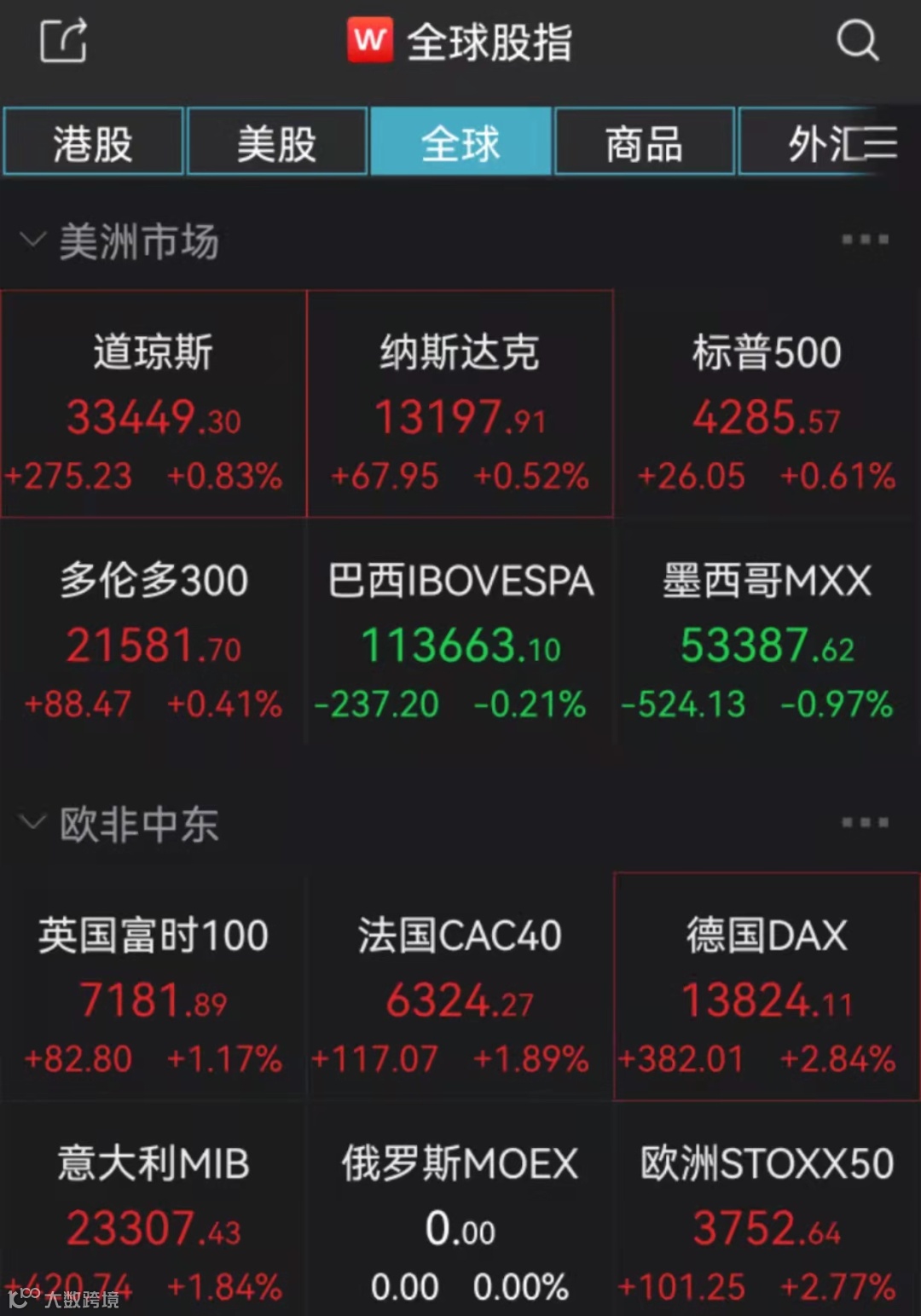 据Wind数据,截至北京时间22:32,德国DAX指数涨近3%,法国CAC40指数、意大利MIB指数均涨近2%,英国富时100指数涨逾1%;道琼斯工业指数、纳斯达克指数、标普500指数分别涨0.83%、0.52%、0.61%。