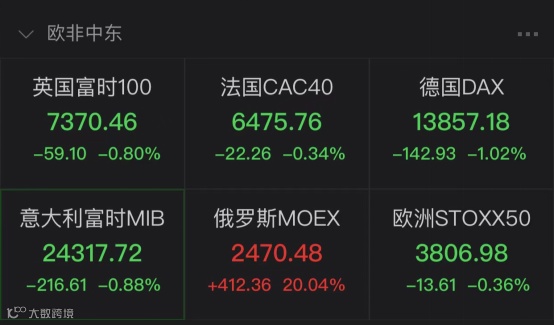 金融市场方面,欧洲主要股指盘中走软,国际油价则大涨。截至北京时间19:50,英国富时100指数、意大利富时MIB指数、德国DAX指数、法国CAC40指数分别下跌0.80%、0.88%、1.02%、0.34%。