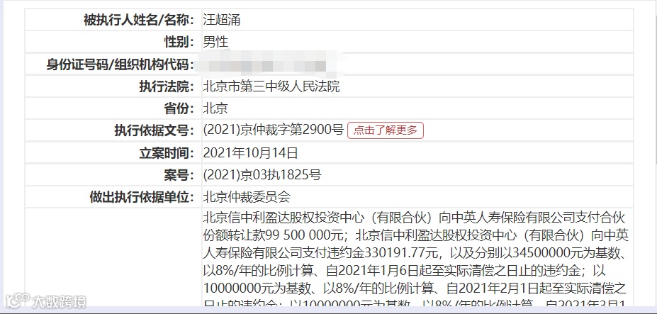 汪超涌被纳入失信被执行人,与信中利未向中英人寿保险按期支付合伙份额转让款以及相关违约金有关。