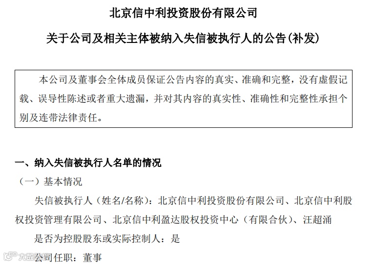 公告显示,失信被执行人包括北京信中利投资股份有限公司、北京信中利股权投资管理有限公司、北京信中利盈达股权投资中心(有限合伙)、汪超涌。