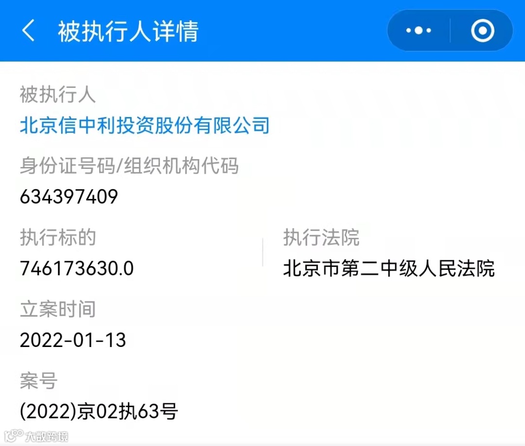 天眼查App显示,近期,信中利新增一条被执行人信息,执行标的7.4亿余元,执行法院为北京市第二中级人民法院,案件涉及相关股权转让纠纷,立案时间为2022年1月13日。