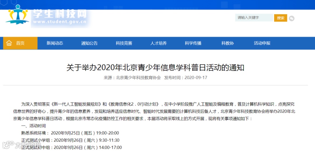 正式测试小学组:2020年9月26日(周六)9:30-11:30